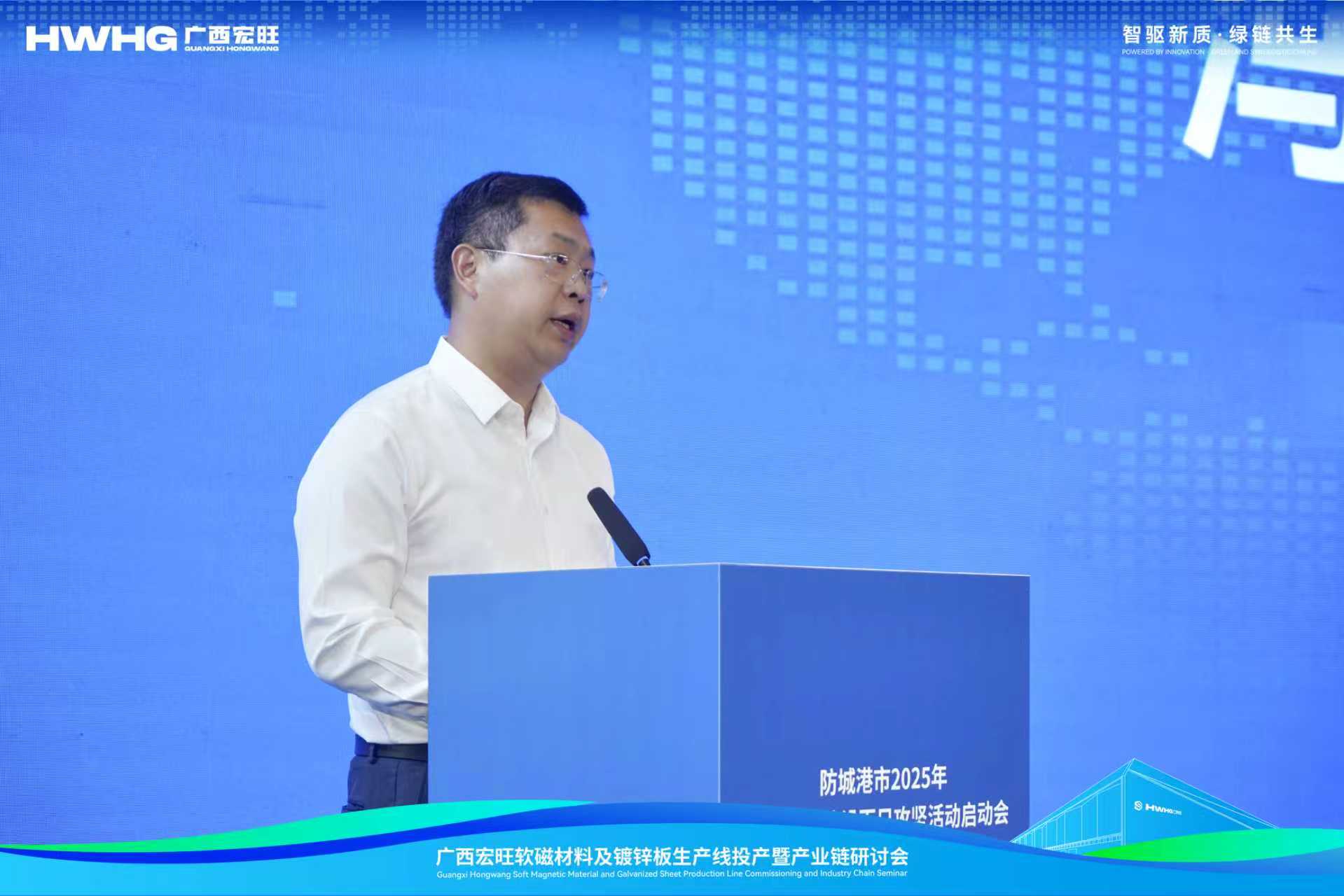 邱明宏市长在致辞中向各位嘉宾和企业家的到来表示热烈欢迎,对广西宏旺软磁材料及镀锌板生产线正式投产表示诚挚祝贺,并介绍了防城港市重大项目建设、经济社会发展情况。他指出,广西宏旺项目从落地到投产仅用13个月时间,是产业协作园区防城港片区的第一个投产项目,具有标志性意义,更加坚定防城港市服务国家战略、抢抓发展机遇、狠抓重大项目、服务重大项目的信心和决心。防城港市将充分利用制造业优势,以人工智能引领全市高质量发展,倾力打造一流营商环境,做到定一件、干一件、成一件,与企业同心同行,共铸辉煌。同时,也期待防城港市能涌现出更多“宏旺式”的好企业、大企业。